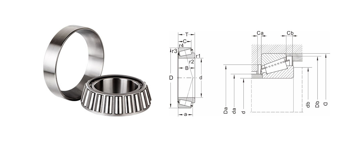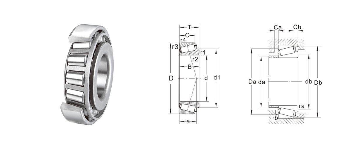 DIN720 | ISO355 | d | D | B | C | T | r1,r2 min | r3,r4 min | a | Pelinciran gris | Pelinciran minyak | Beban dinamik | Beban statik | e | Y | Yo | Da max | db min | da min | Db min | Ca min | Cb min | |
